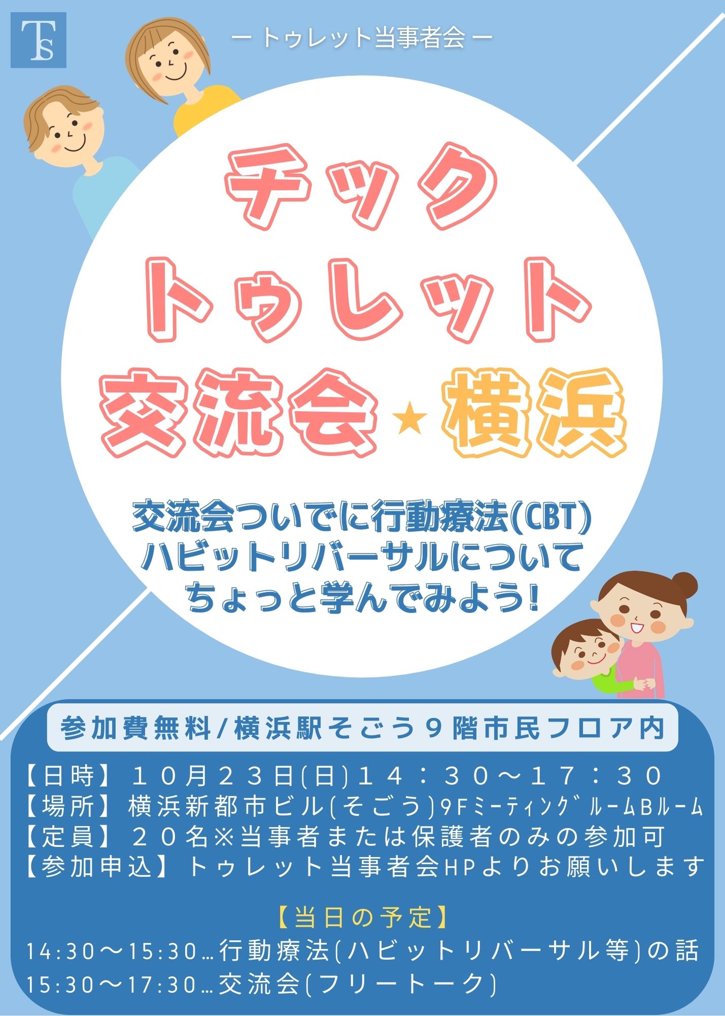 ※今回の横浜交流会には、トゥレット症の啓発を目的に、地方テレビ局の取材が入る可能性があります。取材は当会のメンバーで対応予定ですが、もし取材(匿名モザイク)にご協力いただける方がおられましたら幸いです。また、取材に問題のある方は、お申し込みの際備考欄に取材NGとご記載いただくか、当日主催者にその旨お伝えくださいませ。取材の影響がないよう適切に対応させていただきます。