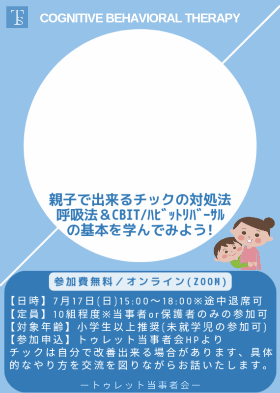 ※チックへの認知行動療法(CBIT/ハビットリバーサル・呼吸法・ERP)は、チックを完治させる方法ではなく、チックを上手に管理コントロールするスキルを学ぶものです。そのためチックの改善度合いも個々に異なります。また、この療法でチックを改善するためには、当事者の治療への前向きな姿勢がとても大切です、以上のことを予めご理解の上ご参加ください。